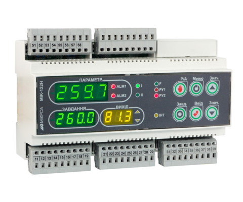 Двоканальний мікропроцесорний регулятор МІК-122Н призначений для автоматичного регулювання та контролю технологічних параметрів у промислових процесах. Забезпечує ручне та автоматичне регулювання технологічних параметрів: температури, тиску, рівня, вологості, витрати та інших фізичних величин у різних галузях промисловості. Передбачено два незалежних ПІД регулятори.